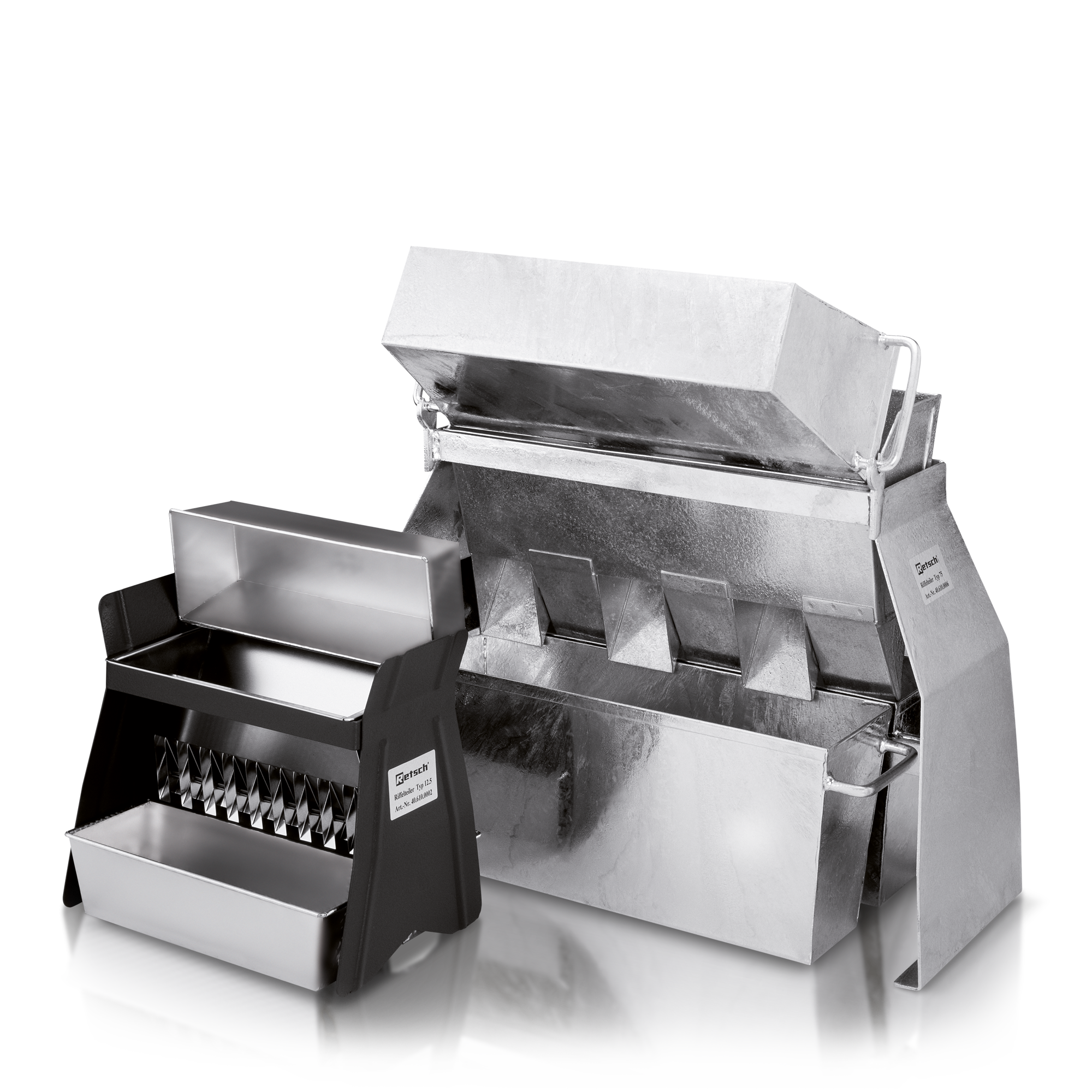 RETSCH dodává děliče vzorků jako rotační děliče a žlábkové děliče. Tyto přístroje rozdělí všechny sypké materiály tak, aby charakteristická složka každé frakce vzorku přesně odpovídala charakteristice původního objemového vzorku.