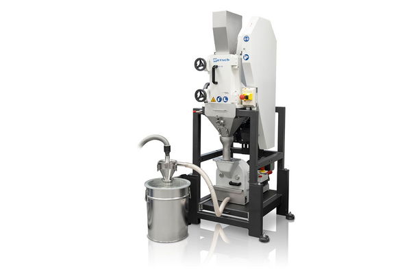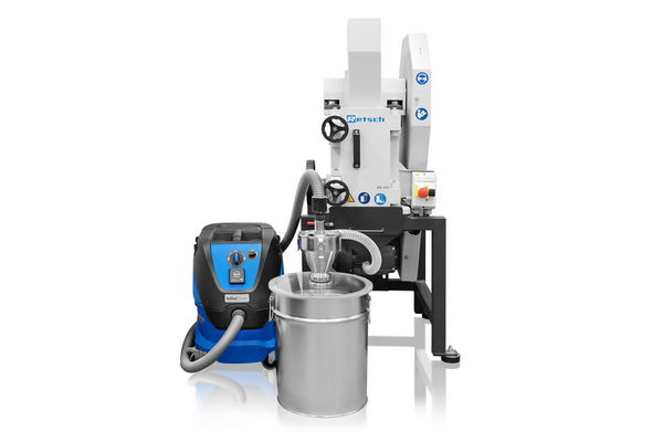 The large volume receptacle accepts up to 26 liter of sample and comes with a flexible connection flange and a carrier on wheels. This version is the best choice for dust-free operation.