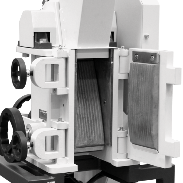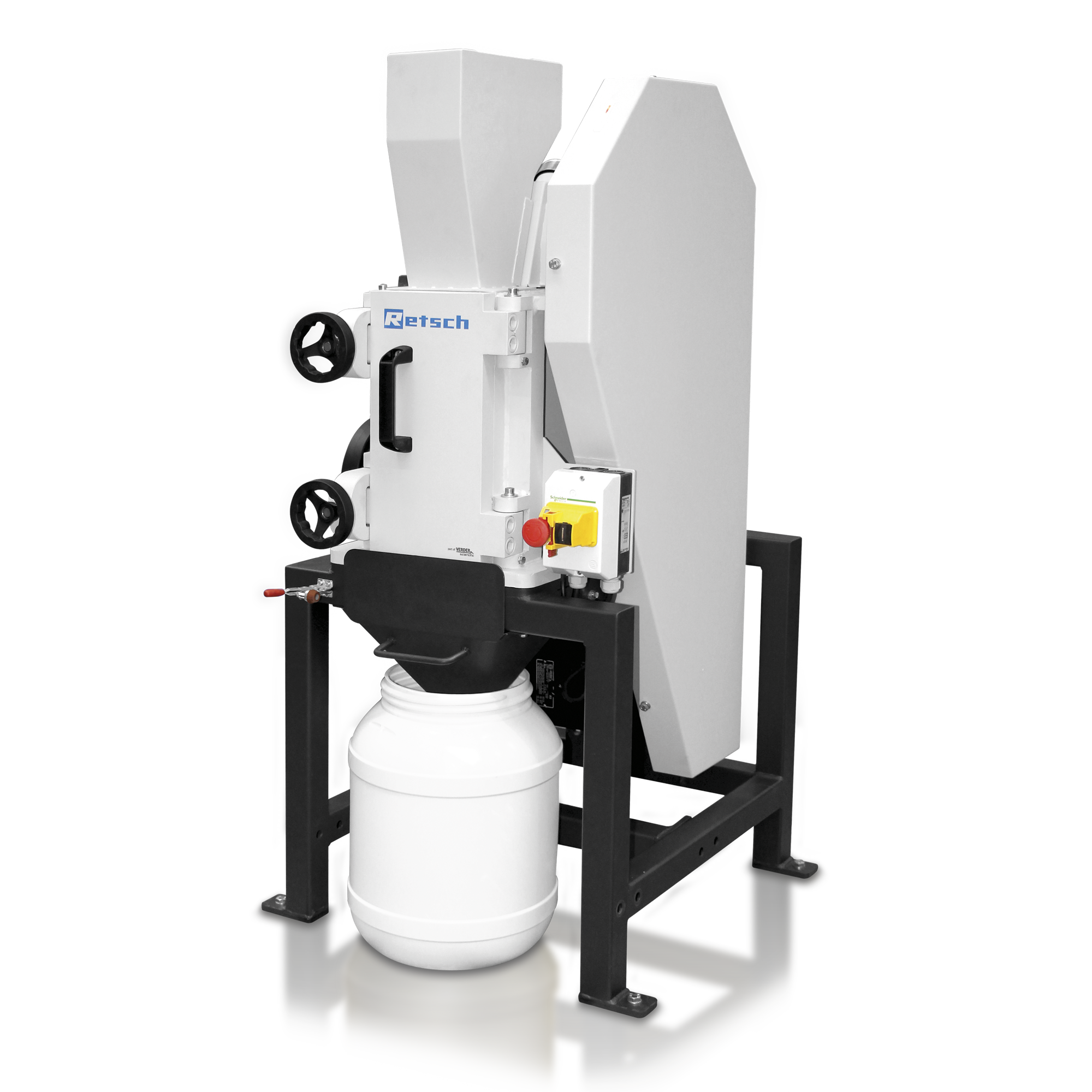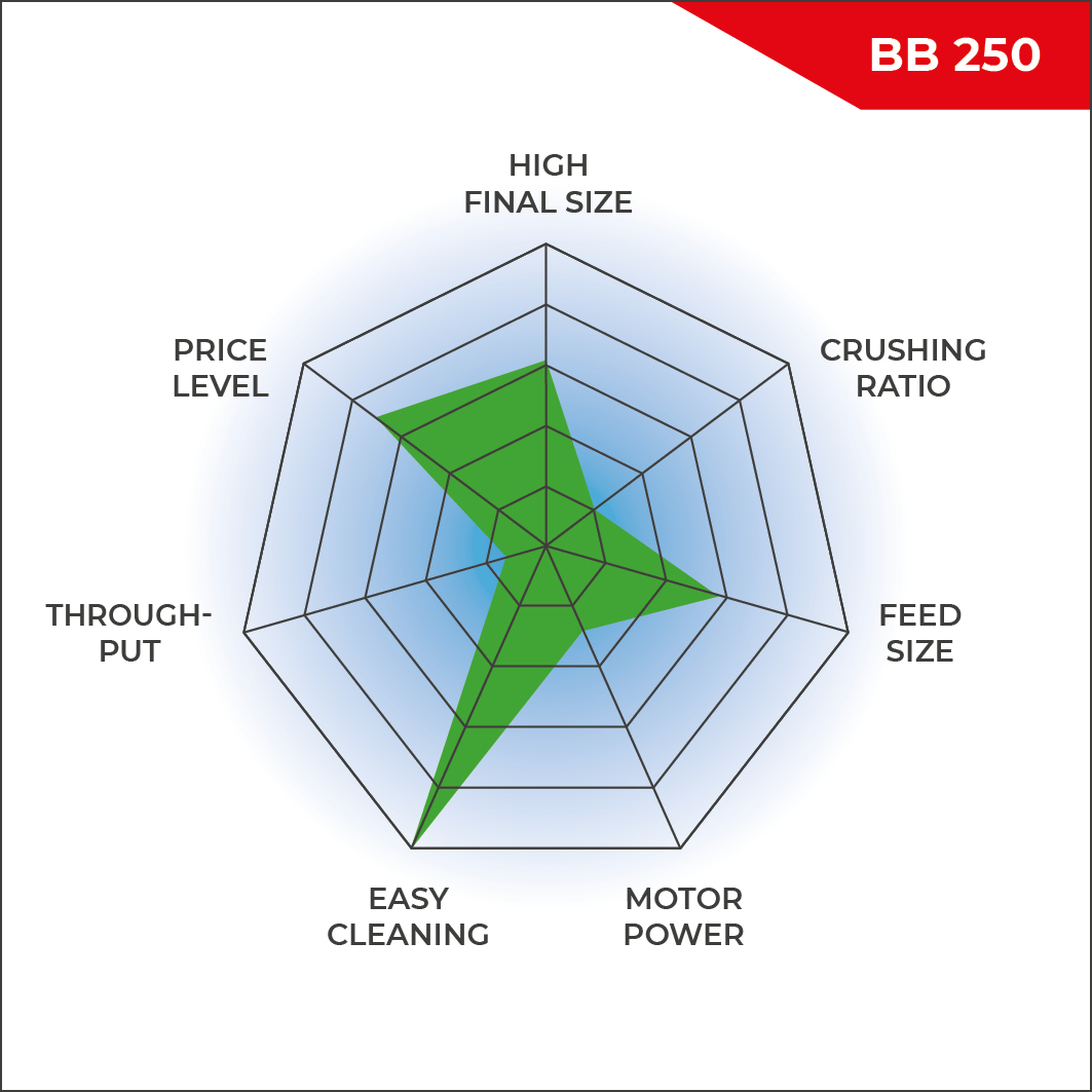 A front door gives direct access to the crushing chamber at a perfect height for ergonomic and easy cleaning. The feed hopper with splash-back protection can be removed quickly and easily. The Jaw Crusher BB 250 has a connection for dust extraction and is protected against mechanical overload. A scale indicates the wear of the breaking jaws, informing the user when it is time for an exchange.
