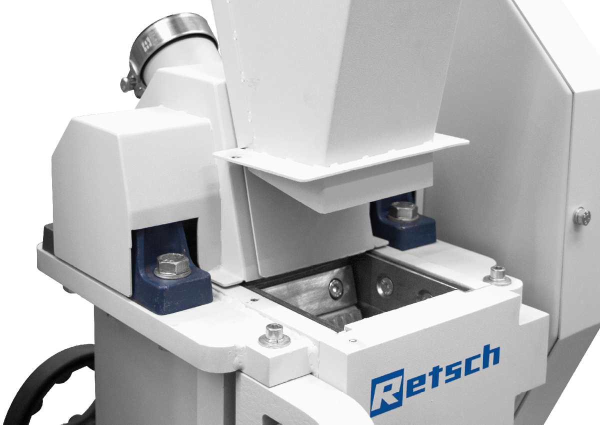 Safety is a top priority with RETSCH jaw crushers. The feed hopper with splash-back protection cannot be accessed by hand. A safety switch and the brake motor ensure an immediate stop if the unit is opened or switched on incorrectly.