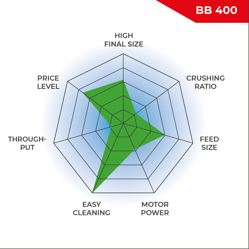 A front door gives direct access to the crushing chamber at a perfect height for ergonomic and easy cleaning. The feed hopper with splash-back protection can be removed quickly and easily. The BB 400 has a connection for dust extraction and is protected against mechanical overload. A scale indicates the wear of the breaking jaws, informing the user when it is time for an exchange.