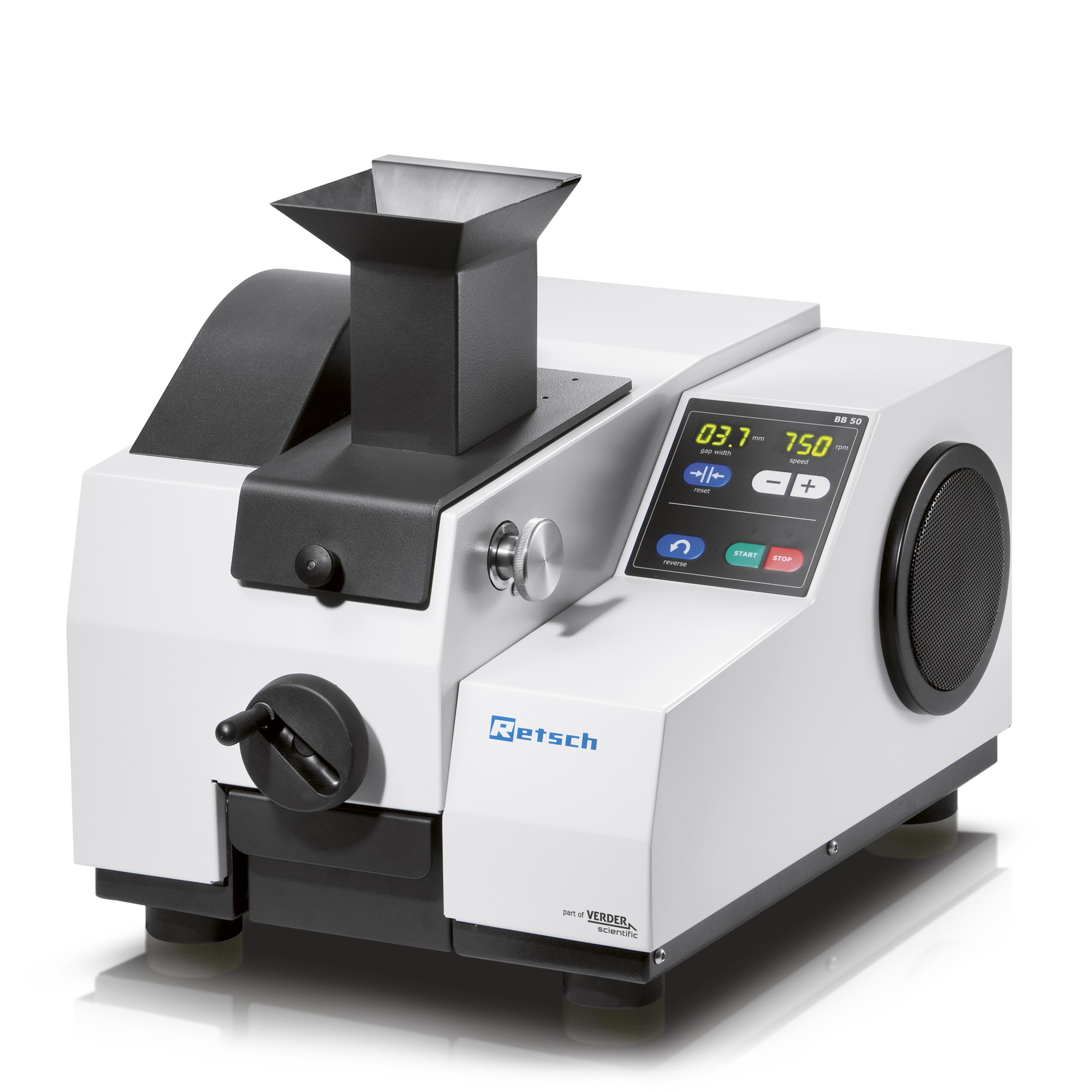 The BB 50 is designed for efficient and convenient size reduction. The variable speed can be set between 550 and 950 min-1 to adapt the crushing process to sample requirements. The possibility to reverse the rotating direction is helpful if too much sample material has been fed to the crusher causing it to block. The simple push of a button restarts the process. Due to permanently lubricated bearings and its solid design, the BB 50 jaw crusher is virtually maintenance-free.