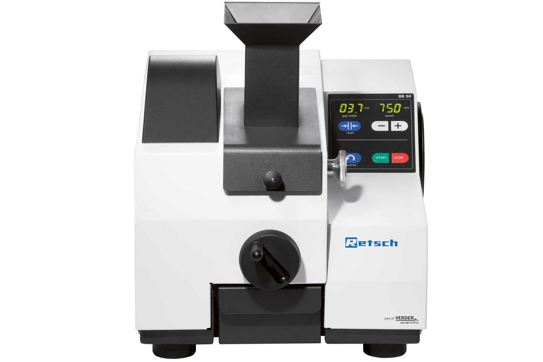 Working with the BB 50 jaw crusher is easy and safe. The large, clearly structured operating panel allows for digital display of parameters such as gap width and speed. The sample material is conveniently fed to the crusher via the large hopper equipped with splash-back protection.